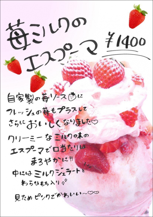 カフェ 投稿日2022.04.22 ◇かき氷!苺ミルクのエスプーマ◇ この記事は、投稿から半年以上が経過しています。 料金やサービス内容など、現在のサービス内容と異なる場合がございます。 かき氷【苺ミルクのエスプーマ】 4月23日(土)から販売開始いたします!! フレッシュ苺を使用した期間限定商品です。 今年のかき氷は、GWから種類を増やして本格的に販売開始いたします♪
