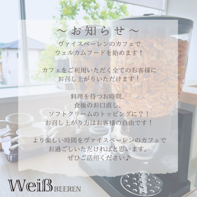 カフェ 投稿日2024.06.24 ◇ヴァイスベーレンカフェからのお知らせ◇ この記事は、投稿から半年以上が経過しています。 料金やサービス内容など、現在のサービス内容と異なる場合がございます。 ウェルカムフード始めました(*^^*)