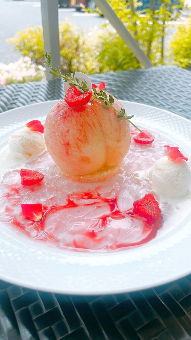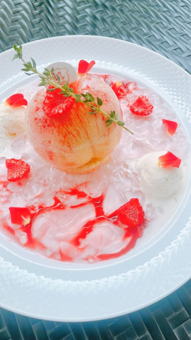 カフェ 投稿日2025.07.06 ◇もものデセール◇ ヴァイスベーレンカフェ 新商品「もものデセール」 桃を丸ごと使用した 旬を贅沢に味わえる一品です! 中にはカスタードクリームをたっぷりと詰め 桃のゼリーとラズベリーソース、ミルクジェラートで爽やかに仕上げました(^^♪ ぜひご賞味ください(*^^*)