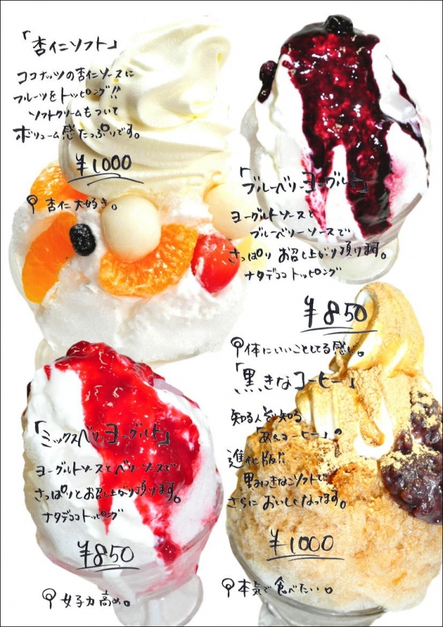カフェ 投稿日2016.04.01 ☆かき氷☆ この記事は、投稿から半年以上が経過しています。 料金やサービス内容など、現在のサービス内容と異なる場合がございます。 4月2日 土曜日から 大人気の【かき氷】!! 始めます!! 新しいメニューも登場!! 杏仁ソフト!! 黒きなコーヒー!! ブルーベリーヨーグルト!! ミックスベリーヨーグルト!! どれも美味しく出来上がりましたので 是非、ご賞味下さい。