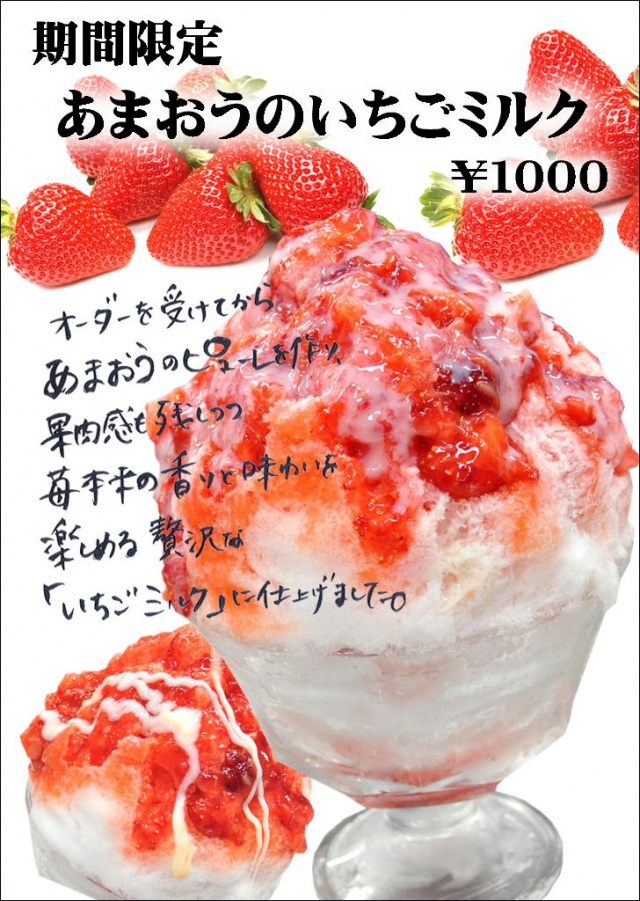 カフェ 投稿日2017.04.04 ◇かき氷解禁します◇ この記事は、投稿から半年以上が経過しています。 料金やサービス内容など、現在のサービス内容と異なる場合がございます。 苺が美味しい時期になりました。 あまおうを贅沢に使用した【あまおうの苺ミルク】 オーダーを受けてから作るソースは 味も香りも文句なしです。 錬乳をたっぷりかけてご提供致します。 4月6日からの販売となります。 もちろん、大人気の【ココマングー】など 他の商品もいくつかご用意しております。