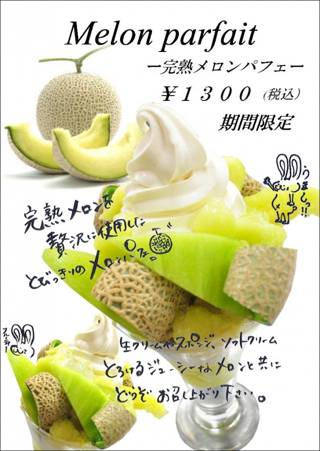 カフェ 投稿日2017.05.07 ◇完熟メロンパフェ◇ この記事は、投稿から半年以上が経過しています。 料金やサービス内容など、現在のサービス内容と異なる場合がございます。 【あまおうパフェ】が終了致しました。 次は【完熟メロン】!! 贅沢にメロンを使用した幸せ感溢れるパフェです。 5月8日からカフェにてお召し上がり頂けます。
