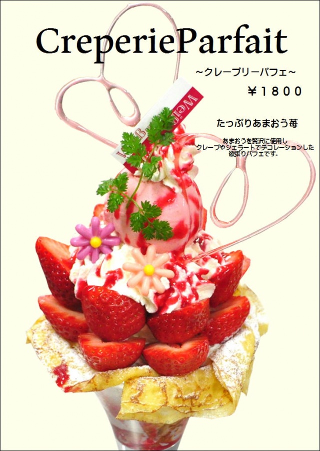 カフェ 投稿日2018.01.23 ◇CreperieParfait◇ この記事は、投稿から半年以上が経過しています。 料金やサービス内容など、現在のサービス内容と異なる場合がございます。 ◇クレープリーパフェ◇ 【たっぷりあまおう苺】の登場!! 1月26日から販売開始です。 あまりの可愛さにときめいてしまうパフェですよ( *´艸`)
