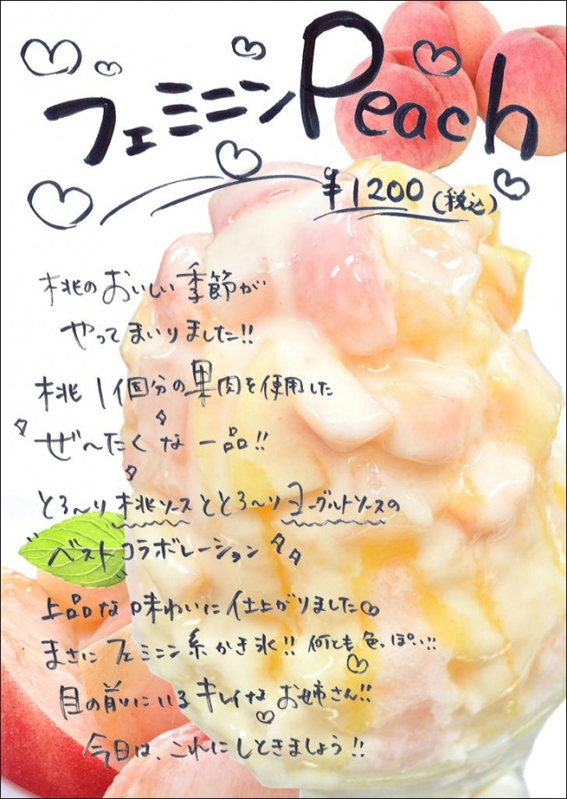 カフェ 投稿日2018.07.07 ◇フェミニンPeach◇ この記事は、投稿から半年以上が経過しています。 料金やサービス内容など、現在のサービス内容と異なる場合がございます。 桃のかき氷解禁です!! 明日、7月8日から販売開始です!