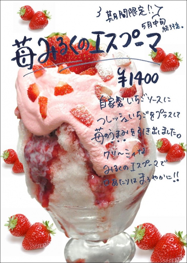 カフェ 投稿日2019.03.24 ◇かき氷解禁◇ この記事は、投稿から半年以上が経過しています。 料金やサービス内容など、現在のサービス内容と異なる場合がございます。 3月30日(土曜日)より かき氷【苺みるくのエスプーマ】を 10時より販売開始致します。