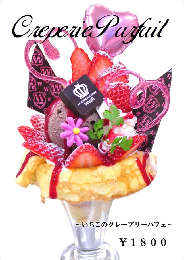 カフェ 投稿日2020.01.30 ◇苺のクレープリーパフェ◇ この記事は、投稿から半年以上が経過しています。 料金やサービス内容など、現在のサービス内容と異なる場合がございます。 2月1日土曜日から販売開始です。 【苺のクレープリーパフェ】 今年は、オリジナルショコラもトッピングしてみました。