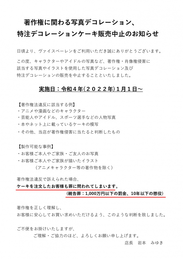 バースデーケーキ 投稿日2021.12.16 ◇デコレーションケーキに関するお知らせ◇ この記事は、投稿から半年以上が経過しています。 料金やサービス内容など、現在のサービス内容と異なる場合がございます。 現在、新たにご提案できるバースデーケーキを計画中です。 また内容につきまして、販売が決まるまではお問い合わせ頂いてもお答えいたしかねますので ご了承の程、宜しくお願い致します。 今後も、お客様により安全に、安心してご利用いただけるよう尽力して参りますので、 変わらぬご愛顧を賜りますようお願い申し上げます。 店長 岩本みゆき