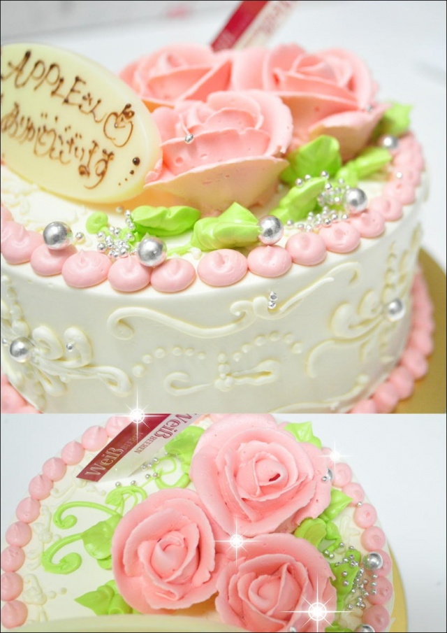 バースデーケーキ 投稿日2017.12.21 ◇バタークリームのデコレーション◇ この記事は、投稿から半年以上が経過しています。 料金やサービス内容など、現在のサービス内容と異なる場合がございます。 スポンジ生地とバタークリームで仕上げたデコレーション。 パイピングとピンクの薔薇の花で豪華に仕上げました。