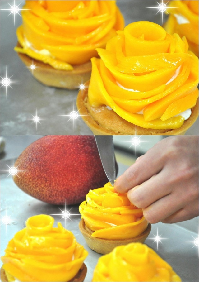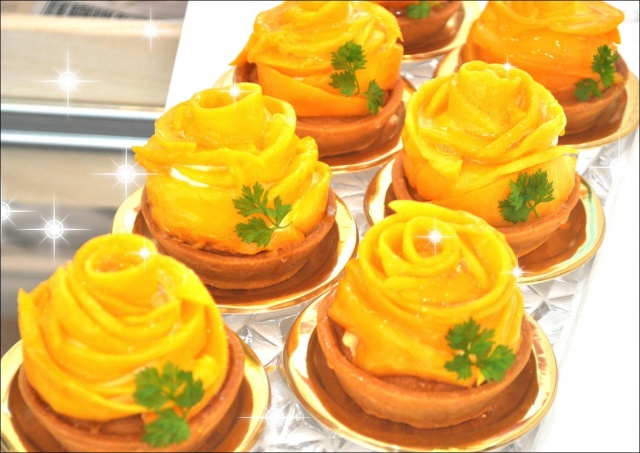 ケーキ全般 投稿日2017.06.03 ◇宮崎マンゴーのタルト◇ この記事は、投稿から半年以上が経過しています。 料金やサービス内容など、現在のサービス内容と異なる場合がございます。 NEW!【宮崎マンゴーのタルト】¥480 とろけるような味わいの果肉を 一枚一枚丁寧にスライスして 薔薇に見立てて仕上げました。