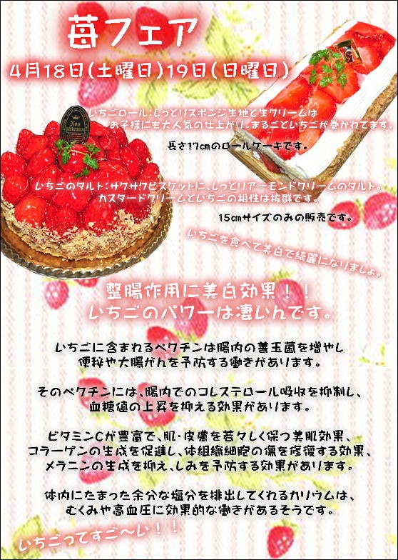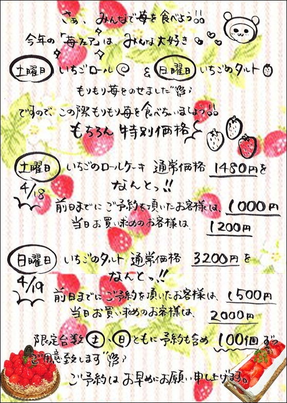イベント 投稿日2015.04.02 今年も【いちごフェア】やります( *´艸`) この記事は、投稿から半年以上が経過しています。 料金やサービス内容など、現在のサービス内容と異なる場合がございます。 ということで、かなり【お得】な価格になっております。 もちろん、電話でのご予約も承っておりますので たくさんのご注文、お待ち申し上げております。 当日の電話予約も、在庫がございましたら 可能ですが、当日販売価格となりますのでご了承下さい。 お一人様の限定個数はございません。 ご予約と、当日販売で100個に達しましたら 販売終了とさせて頂きますので ご理解の程、よろしくお願い申し上げます。 何かご不明な点がございましたら、お気軽にお問い合わせくださいませ。 店内が混雑する場合がございますが、ご理解とご協力を お願い申し上げます。 場合によっては、整理券を配布させて頂きます。