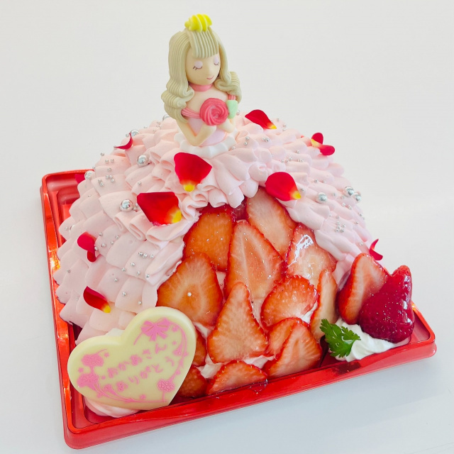 バラをあしらったピンクのドレスが華やかなドールケーキ。