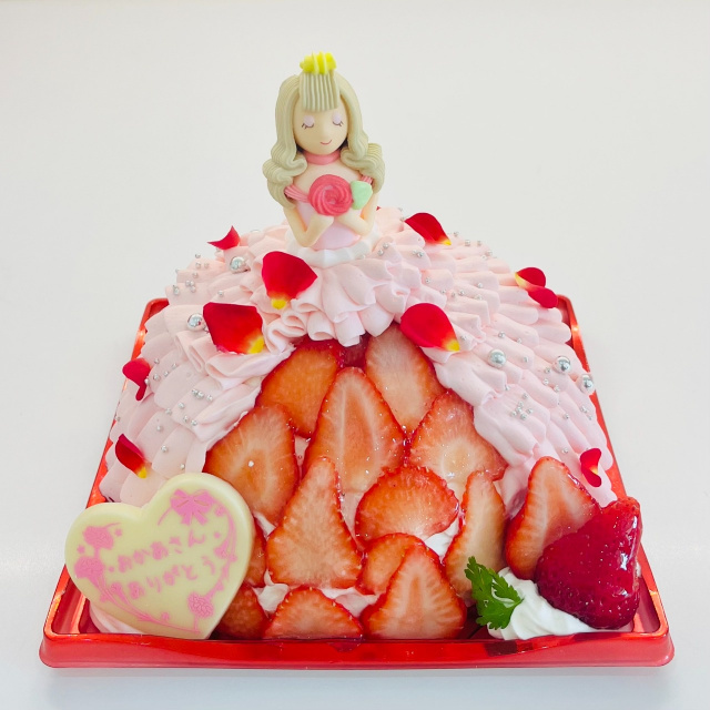 苺の飾りと「おかあさん ありがとう」のメッセージプレート付きで、