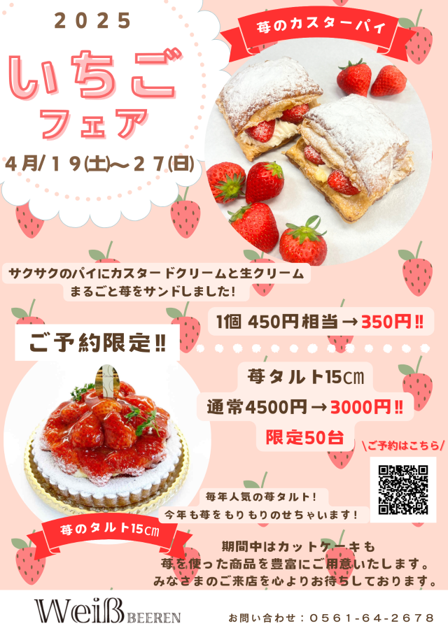 イベント 投稿日2025.04.20 ◇いちごフェア2025◇ この記事は、投稿から半年以上が経過しています。 料金やサービス内容など、現在のサービス内容と異なる場合がございます。 いちごフェア2025を開催中です!!! まるごと苺とカスタードクリーム・生クリームをサンドしたサクサクのカスターパイと 苺タルト15cm(ご予約限定)をフェア限定価格で販売しております♪ さらに、苺を使った商品を多数ご用意しております(*^^*) ぜひこの機会に、旬の苺を使ったケーキをお楽しみください(^^♪