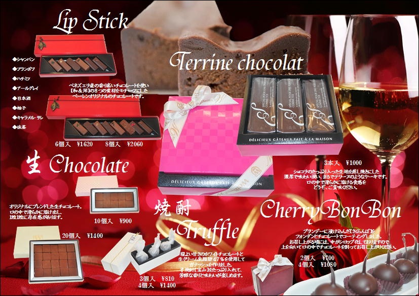 イベント 投稿日2016.01.25 ♡オリジナルショコラ♡ この記事は、投稿から半年以上が経過しています。 料金やサービス内容など、現在のサービス内容と異なる場合がございます。 もうすぐバレンタイン(^^♪ まず、自分用にご試食してみてはいかがですか? 商品も価格帯も様々ご用意致しました。 今回、新商品の【テリーヌショコラ】は店長一押し商品ですよ!! 滑らかな口どけは、生チョコともちょっと違う感じで、 チョコレートの濃厚さがしっかり味わえます。 チョコレートのブレンドにもこだわり ミルクチョコレートを加えることで まろやかさとやさしい甘みをプラスしました。 1個 300円 3個箱入り 1000円