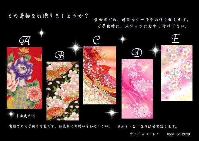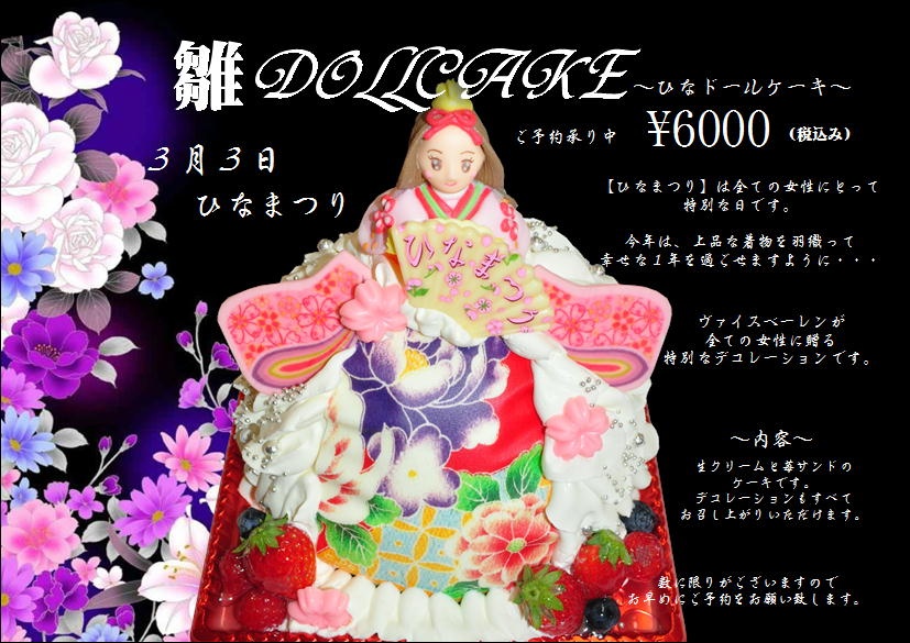 イベント 投稿日2016.02.15 ◇雛DOLLケーキ◇ この記事は、投稿から半年以上が経過しています。 料金やサービス内容など、現在のサービス内容と異なる場合がございます。 今年の【雛ドールケーキ】は、 気品ある優雅な女性をイメージして制作致しました。 また、今回は着物が選べちゃうんですよ( *´艸`) それぞれタイプが違うものをご用意致しましたので 是非、オリジナルの雛ドールを自分用に? もちろん、プレゼントにはとっておきのアイテムです。 数に限りがございますので お早めにご予約をお願い致します。 また電話でのお問合せ・ご予約も承っております。