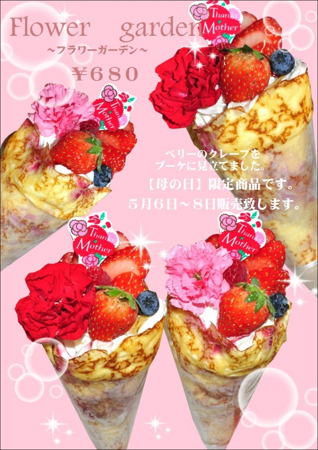 イベント 投稿日2016.04.25 ♡母の日のプレゼント♡ この記事は、投稿から半年以上が経過しています。 料金やサービス内容など、現在のサービス内容と異なる場合がございます。 人気のドールケーキとブーケのかたちをした テイクアウト用のベリーのクレープをご用意致しました。 5月6日(金曜日)~8日(日曜日)までの 販売となります。 ご予約も可能です。