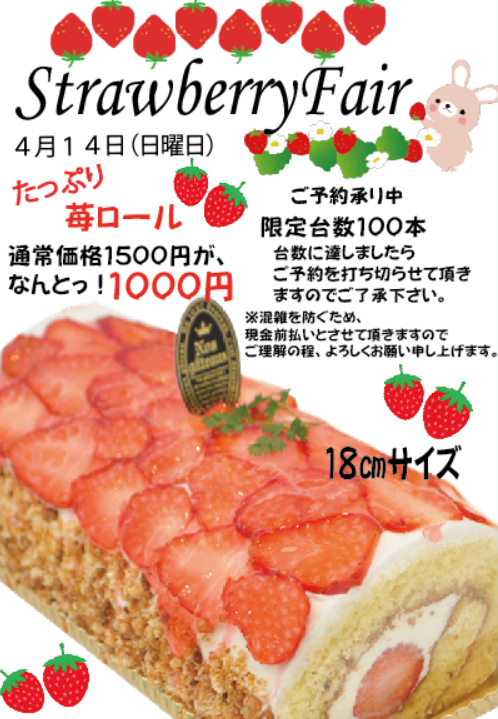 イベント 投稿日2019.03.16 ◇苺フェア◇ この記事は、投稿から半年以上が経過しています。 料金やサービス内容など、現在のサービス内容と異なる場合がございます。 4月14日(日曜日)は 【苺ロール 限定100本】 本日よりご予約を開始致します。 ※混雑を防ぐため、店頭でのご予約と前払いをお願い致します。 お手数おかけしますが、ご理解とご協力の程 お願い申し上げます。