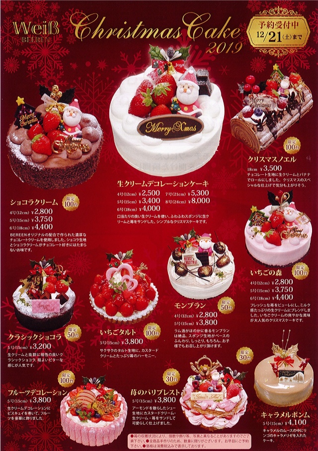 イベント 投稿日2019.11.01 ◇Xmasケーキ◇ この記事は、投稿から半年以上が経過しています。 料金やサービス内容など、現在のサービス内容と異なる場合がございます。 11月1日からクリスマスケーキのご予約を承っております。 ご予約受付は12月21日までとなります。