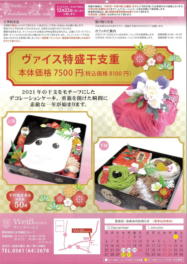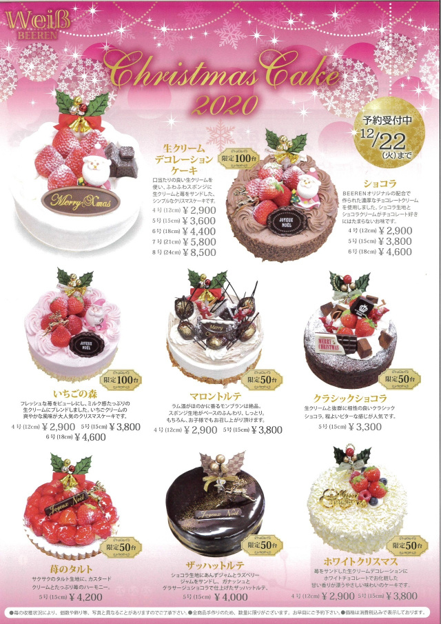 イベント 投稿日2020.10.20 ◇Xmasケーキ2020◇ この記事は、投稿から半年以上が経過しています。 料金やサービス内容など、現在のサービス内容と異なる場合がございます。 クリスマスケーキのご予約が始まります! この価格は、11月1日〜12月19日(土曜)までに、ご予約をいただいたお客様のみの価格となります。 また毎年人気のケーキからご予約がいっぱいになりますので、お早めのご予約をお勧めいたします。 ご予約受付は12月22日(火曜)までとなります。 12月23日(水曜)から、生クリームデコレーション5・6号を店頭にて販売いたします。 12月26日(土曜)はお休みさせていただきます。 年末年始の干支重ケーキ 年末年始の干支重もかわいい牛さんが迎えてくれますよ( *´艸`)