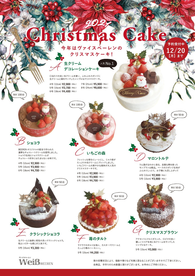 イベント 投稿日2021.10.23 ◇Xmasケーキ◇ この記事は、投稿から半年以上が経過しています。 料金やサービス内容など、現在のサービス内容と異なる場合がございます。 11月1日からクリスマスケーキのご予約が始まります。 限定台数がございますので、ご予約はお早めにお願い致します。 今年からネットでのご予約も可能となりました。 裏面のQRコード又は下記のリンクから簡単に予約できます!! クリスマスケーキを予約する