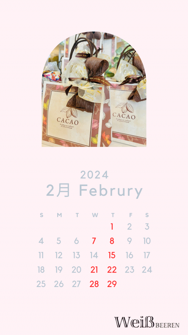 お知らせ 投稿日2024.01.29 ◇2024年2月カレンダー◇ この記事は、投稿から半年以上が経過しています。 料金やサービス内容など、現在のサービス内容と異なる場合がございます。 2024年2月定休日カレンダー 1日(水)定休日 7・8日(水・木)定休日 14日(水)営業<バレンタインデー> 15日(木)定休日 21・22日(水・木)定休日 28・29日(水・木)定休日 14日バレンタインデー当日は営業いたします♪ 皆さまのご来店を心よりお待ちしております(*^^*)