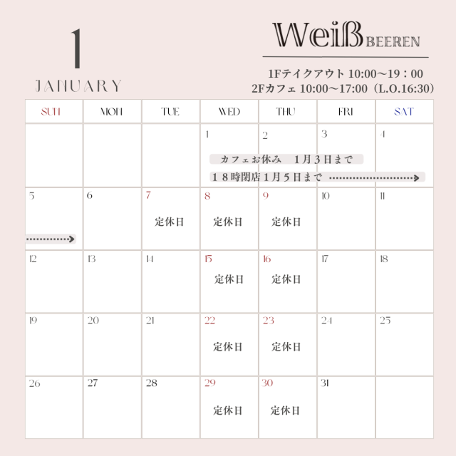 お知らせ 投稿日2024.12.20 ◇2025年1月カレンダー◇ この記事は、投稿から半年以上が経過しています。 料金やサービス内容など、現在のサービス内容と異なる場合がございます。 2025年1月定休日カレンダー 7・8・9日(火・水・木)定休日 15・16日(水・木)定休日 22・23日(水・木)定休日 29・30日(水・木)定休日 クリスマスケーキのご予約は12月20日(金)までです! 12月18日~1月3日までカフェはお休み 12月27日~1月5日まで18時閉店 通常と異なる為、お気を付けてご来店くださいませ
