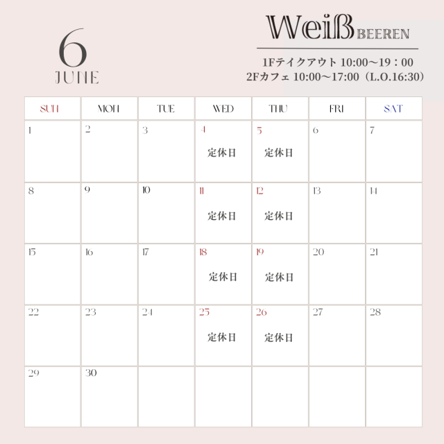 お知らせ 投稿日2025.05.31 ◇2025年6月カレンダー◇ 2025年6月定休日カレンダー 4・5日(水・木)定休日 11・12日(水・木)定休日 18・19日(水・木)定休日 25・26日(水・木)定休日 今年の父の日は「6月15日(日)」です!!! 父の日向け商品もまたお知らせさせていただきます(^^♪ 皆さまのご来店を心よりお待ちしております(*^^*)