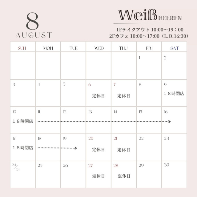お知らせ 投稿日2025.07.13 ◇2025年8月カレンダー◇ 2025年8月定休日カレンダー 6・7日(水・木)定休日 20・21日(水・木)定休日 27・28日(水・木)定休日 8月はお盆期間休まず営業いたします!【13日(水)・14日(木)営業】 ※13日(水)1階テイクアウトのみ(カフェ終日休み) 9日(土)~17日(日)まで18時閉店となります。 ※19日(火)カフェのみ15時閉店(14:30ラストオーダー) お供え用、帰省土産などギフト商品を多数ご用意いたします♪ 皆さまのご来店を心よりお待ちしております(*^^*)