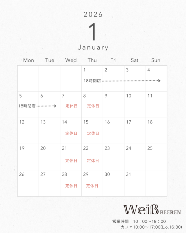 お知らせ 投稿日2025.12.25 ◇2026年1月カレンダー◇ 2026年1月定休日カレンダー 7・8日(水・木)定休日 14・15日(水・木)定休日 21・22日(水・木)定休日 28・29日(水・木)定休日 カフェは1月3日より営業いたします。 1月6日まで18時閉店となります。 1月9日より通常営業いたします。 皆様のご来店を心よりお待ちしております♪