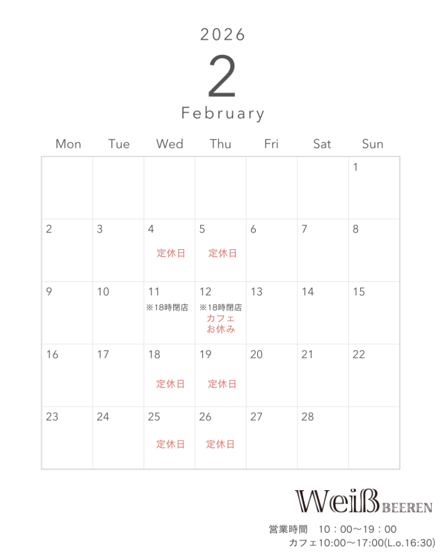 お知らせ 投稿日2026.01.26 ◇2026年2月カレンダー◇ 2026年2月定休日カレンダー 4・5日(水・木)定休日 18・19日(水・木)定休日 25・26日(水・木)定休日 2月11・12日も営業いたします!(18時閉店) 12日はカフェはお休みをいただきます。 バレンタイン商品を沢山ご用意しております(*^^*) 皆様のご来店を心よりお待ちしております♪