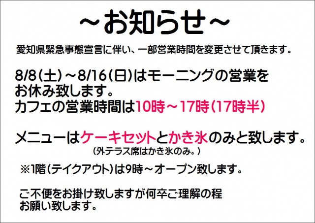 お知らせ 投稿日2020.08.08 ◇お知らせ◇ この記事は、投稿から半年以上が経過しています。 料金やサービス内容など、現在のサービス内容と異なる場合がございます。 愛知県緊急事態宣言に伴い 8月8日~16日までの大型連休期間中 一部営業時間と内容を変更させて頂きますので 何卒 皆さまのご理解とご協力の程 よろしくお願い申し上げます。