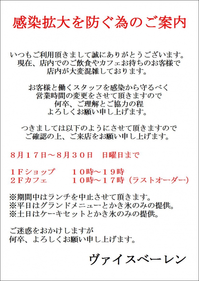 お知らせ 投稿日2020.08.16 ◇お知らせ◇ この記事は、投稿から半年以上が経過しています。 料金やサービス内容など、現在のサービス内容と異なる場合がございます。 営業時間をご確認の上 ご来店をお願い致します。 ご迷惑をおかけしますが 何卒、ご理解とご協力のほど よろしくお願い申し上げます。 ヴァイスベーレン