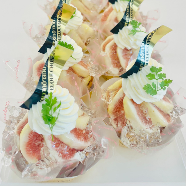 季節のケーキ 投稿日2022.07.12 ◇無花果タルト◇ この記事は、投稿から半年以上が経過しています。 料金やサービス内容など、現在のサービス内容と異なる場合がございます。 季節限定の無花果タルトです! 自家製アーモンドパウダーを使用したタルトの上に、 生クリームとカスタードクリーム、無花果をふんだんに盛り付けました。 上品な甘みととろみのある食感の無花果に、レモン風味のゼリーも添えて 味や食感の変化も楽しめる、後味爽やかなタルトです。 是非、ご賞味ください(*^^*)