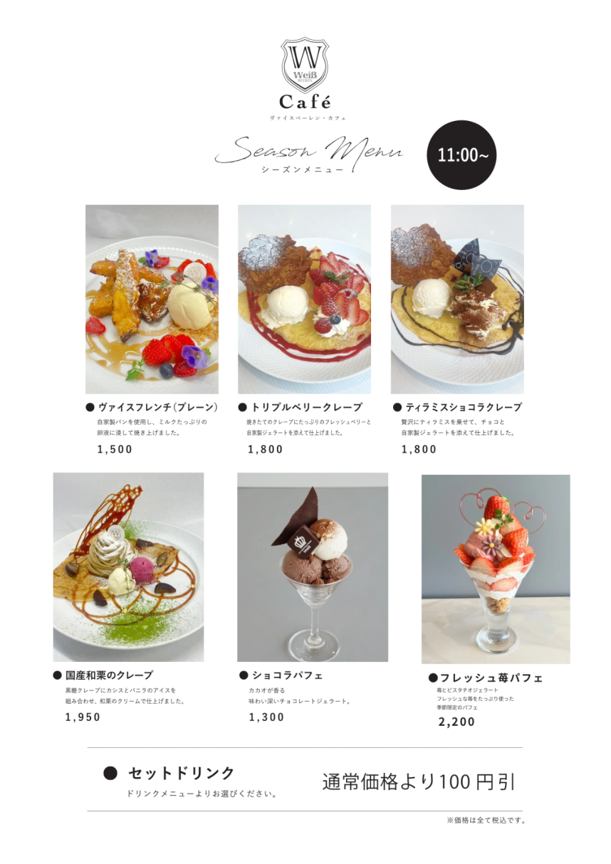 カフェメニュー MENUを大きく ランチMENU (11:00~14:00) MENUを大きく ドリンクMENU (10:00~16:30) MENUを大きく MENUを大きく シーズンMENU (10:00~16:30) MENUを大きく